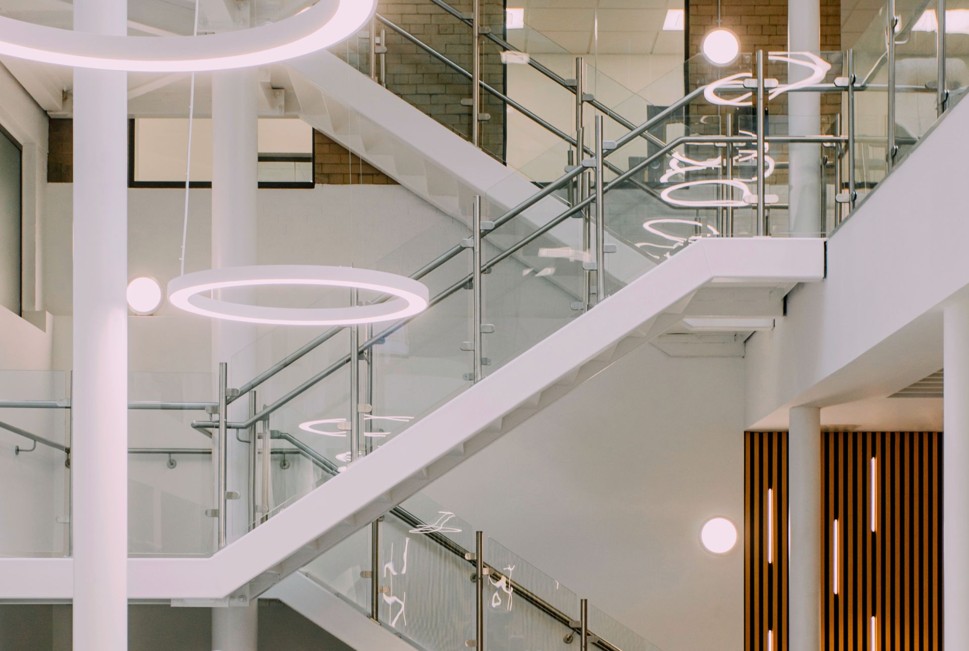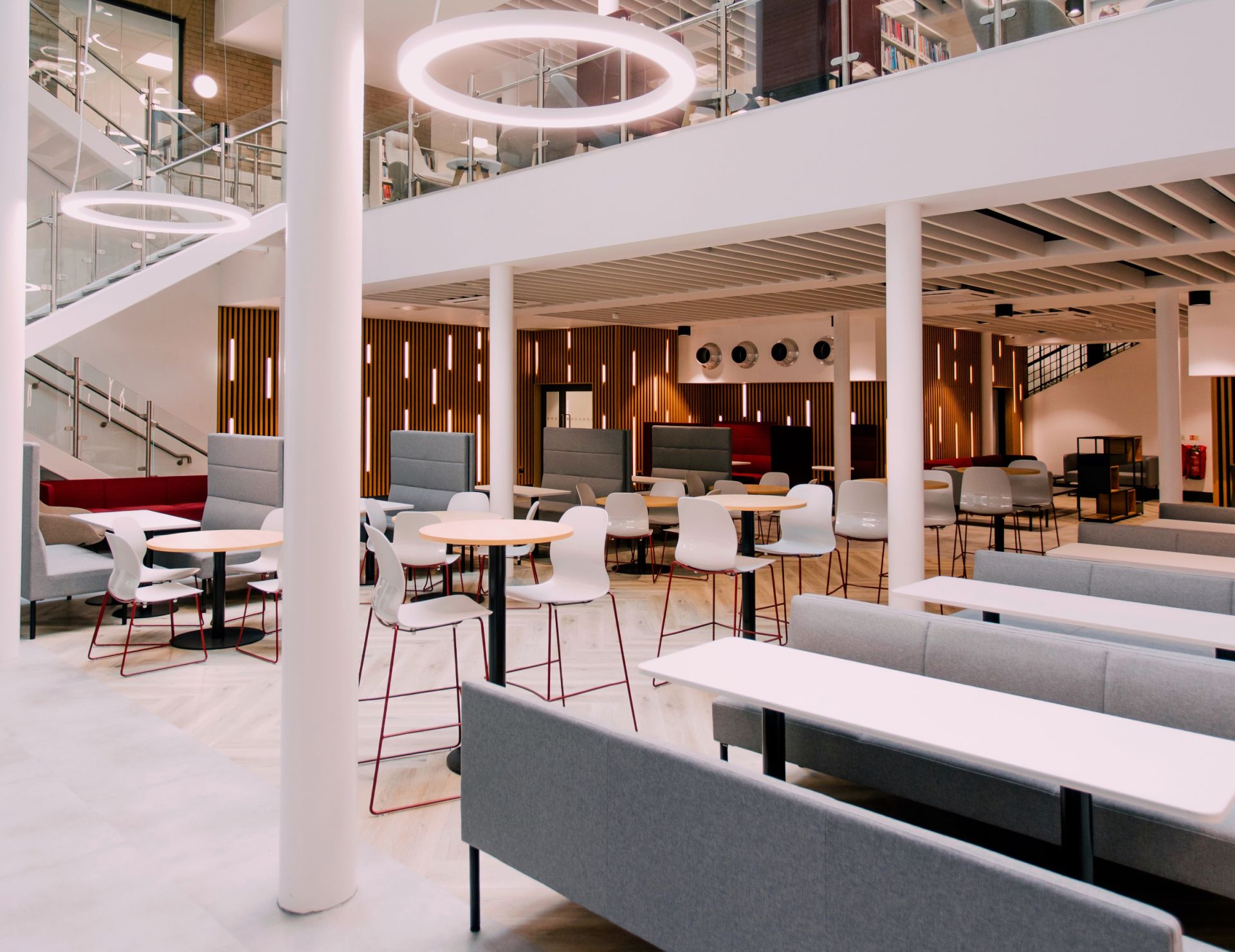 The refurbishment introduced three mezzanine floors into what was once a courtyard, now transformed into a bright atrium with a new roof. To enhance the natural light, roof lights were installed along with halo-style lamps at different levels. Timber panels with integrated vertical lighting add a subtle digital-tech feel.