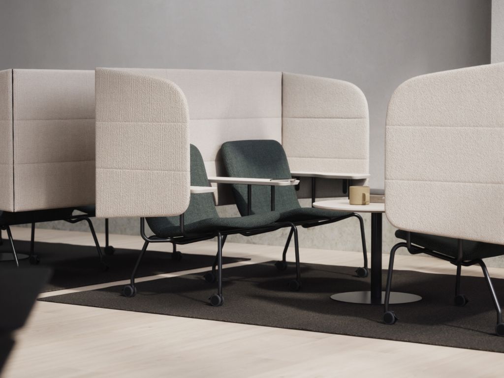 In smaller meeting rooms or group rooms, you may only need side tables, small round tables with pedestal frames or standing tables with barstools. In rooms for more informal meetings, sofas or pouffes can be combined with smaller tables.