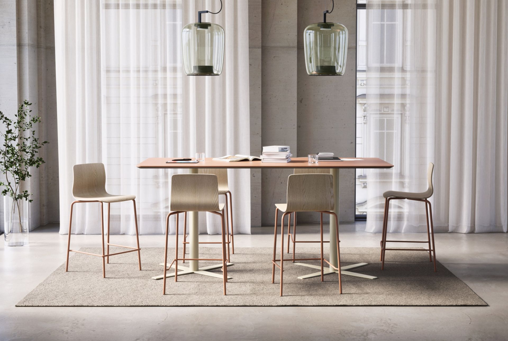 Chat med kryssfot breddar möjligheterna ytterligare – med ett mer öppet underrede erbjuder denna variant generöst med plats för stolar och rörelsefrihet runt bordet. Denna lösning är särskilt anpassad för offentliga miljöer med höga krav på flexibilitet och hållbarhet, men uppskattas också i matsal, lounge och kontor.