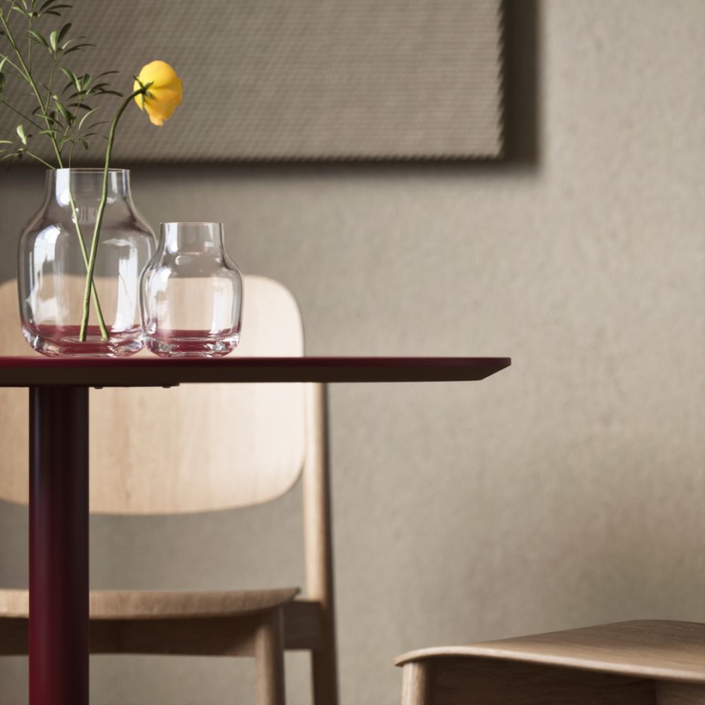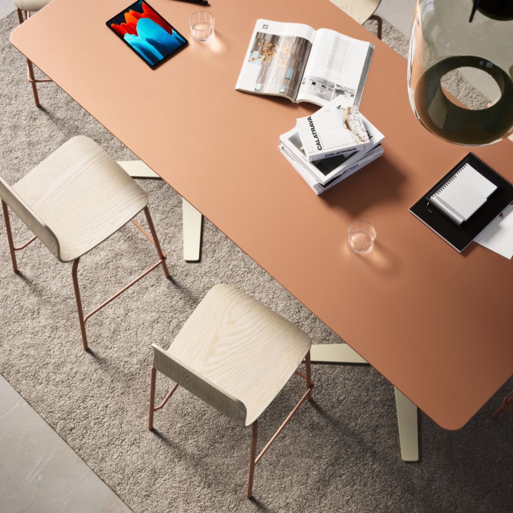 Bordet kan enkelt anpassas med olika former på skivan och lackerade stativ. För ännu fler möjligheter kan stativet varieras med olika RAL-kulörer. Kombinationen av form, färg och ytskikt ger stor frihet att skapa en helhet som passar både miljö och identitet – från stilrena till mer uttrycksfulla lösningar.