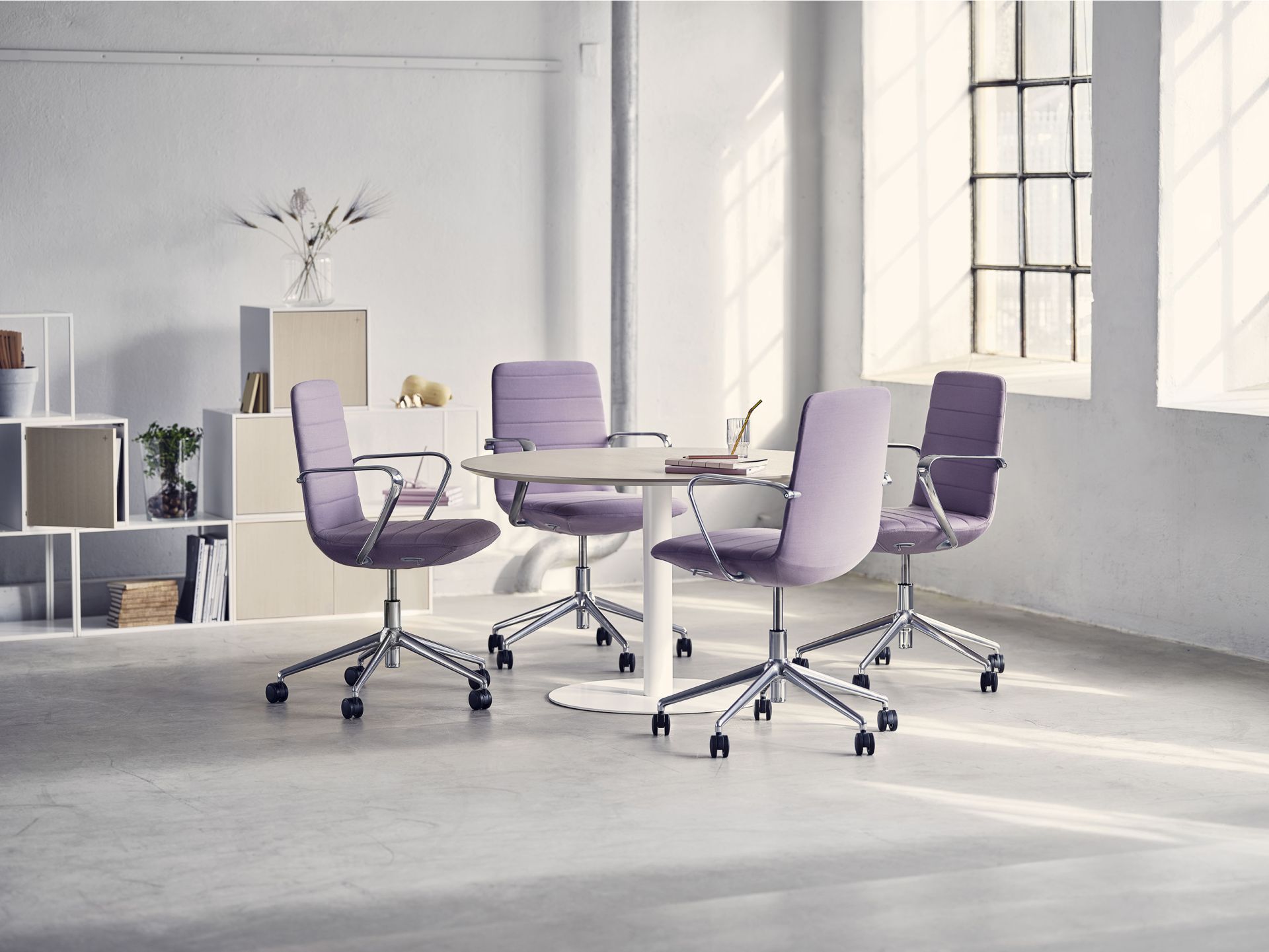 Chat kan användas som coffee table, sidobord eller ståbord. Placera din variant i gemensamma utrymmen med stolar, soffor och sittpuffar eller i bås. Chat är perfekt för pauser med småprat, men gör sig lika bra i arbetsrum – inte minst för att varianter av skivan kan utrustas med infällda eluttag. Inred det lilla mötesrummet med ett lågt bord eller ett ståbord med eller utan barstolar till.